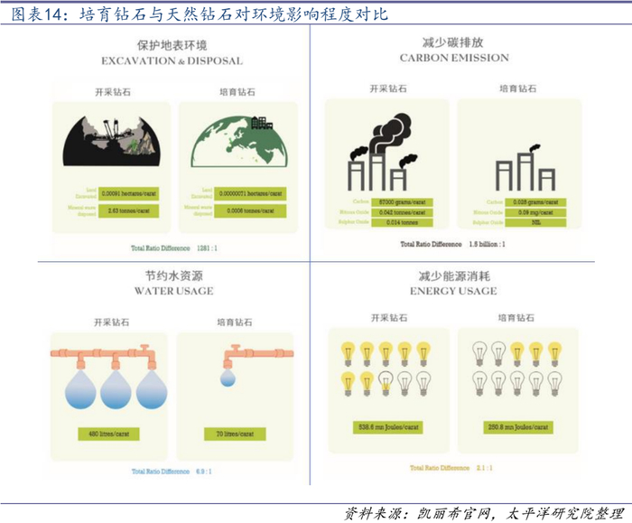 除此之外,从环保角度来看,天然钻石的开采会导致破坏地表环境、增加土地损耗、消耗水资源等,同时还会涉及血钻与冲突钻石等残酷问题。相比天然钻石,培育钻石的出现避免天然钻石带来的残酷现实,同时也避免了环境污染、过度开采等问题。