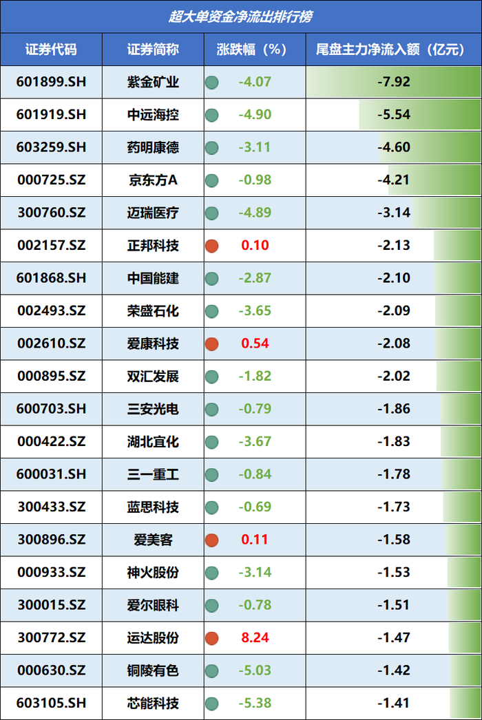 超大单资金今日净卖出较多的个股为紫金矿业、中远海控、药明康德、京东方A,净卖出额分别为7.92亿元、5.54亿元、4.6亿元、4.21亿元。迈瑞医疗、正邦科技、中国能建、荣盛石化、爱康科技、双汇发展等多股遭超大单卖出。