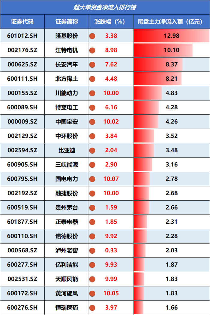 个股资金流向方面,超大单资金今日净买入较多的个股为隆基股份、江特电机、长安汽车、北方稀土,净买入额分别为12.98亿元、10.1亿元、8.37亿元、8.21亿元。川能动力、特变电工、中国宝安、中环股份、比亚迪、三峡能源等多股获超大单买入。