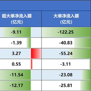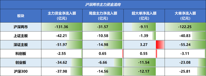 主力资金全天净流出131.36亿元,其中超大单资金小幅净流出9.11亿元,大单资金大举净卖出122.25亿元。创业板、沪深300分别遭超大单卖出11.54亿元、12.17亿元。