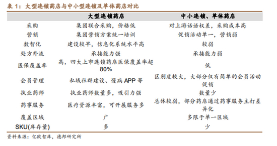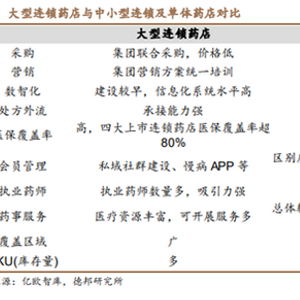大型连锁药店较中小连锁及单体药店有多方面优势。大型连锁药店具有信息化水平高、资金充裕、门店覆盖范围广、SKU多等优点,经营管理能力及抗风险能力强,还能承接中小药店由于经营不善关闭的店铺,从而获得扩张机会。