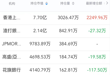 从具体席位看,汇丰银行持仓7.7亿元,渣打银行持仓2.14亿元,JP摩根持仓市值9784万元,高盛持有4698万元,花旗持有4141万元。
