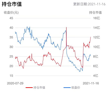 近一年(20201117至20211116),石基信息股价从34.84元降至27.47元,北向资金持仓市值从7.2亿元,增加至12.17亿元。
