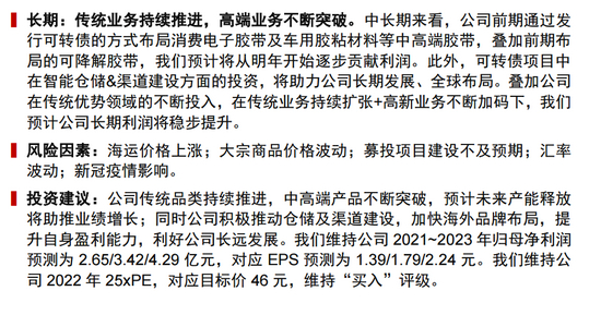 此外,可转债项目中在智能仓储&渠道建设方面的投资,将助力公司长期发展、全球布局。叠加公司在传统优势领域的不断投入,在传统业务持续扩张+高新业务不断加码下,预计公司长期利润将稳步提升。
