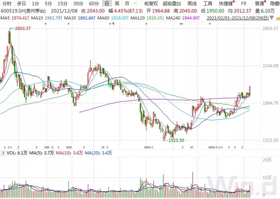 茅台股价重新站上2000元。截至12月8日收盘,贵州茅台大涨4.45%,报收于2043元,这是继今年7月21日之后,时隔近5个月股价重回2000元以上。