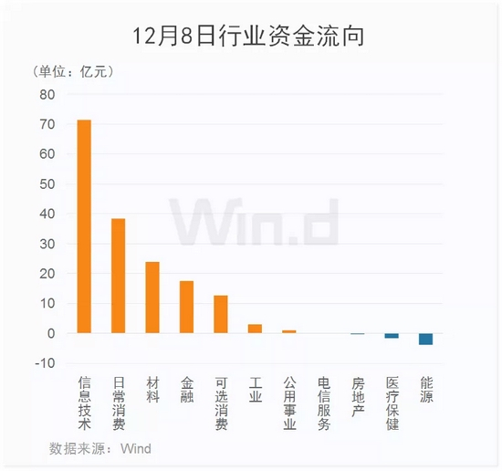从12月8日行业资金流向来看,主力资金净流入100多亿元,多数行业净流入,其中信息技术板块净流入额超过70亿元,位居首位;日常消费、材料、金融等板块净流入额亦较大。仅能源、医疗保健、房地产等板块微幅净流出。