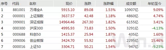 截至12月8日收盘,上证指数涨1.18%报收于3637.57点;深成指涨1.82%报收于14964.46点;创业板指涨1.66%报收于3424.70点,万得全A总成交1.09万亿。