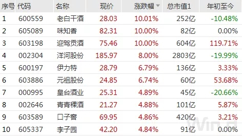 从个股表现来看,老白干酒、味知香、迎驾贡酒涨停,洋河股份、伊利特、元祖股份等个股涨幅居前。
