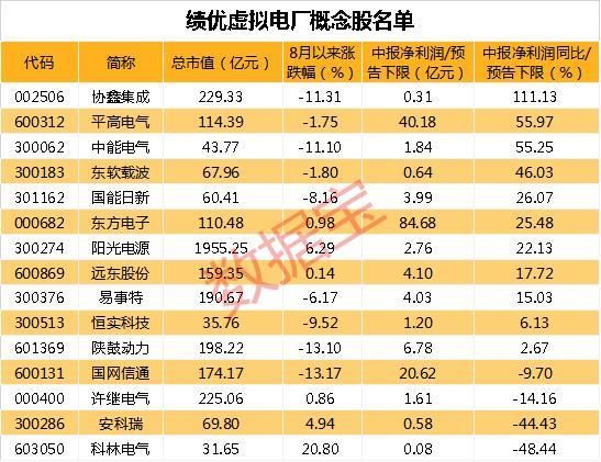 业绩增长方面,18只概念股的归母净利润同比呈现增长,其中协鑫集成、平高电气的业绩同比翻倍增长。