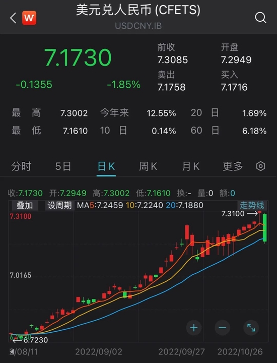 外汇交易中心数据显示,10月26日,在岸人民币兑美元16:30收盘报7.1825,较上一交易日涨1260个基点,升破7.2重要关口,最高触及7.1630。
