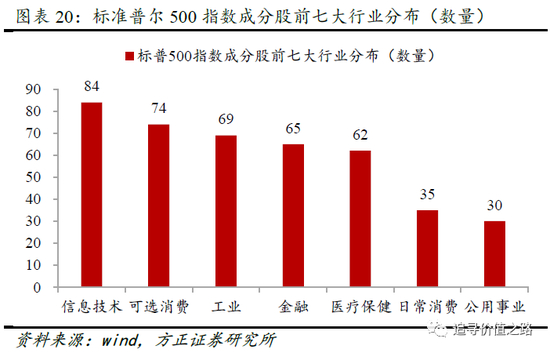 从细分行业来看,标准普尔500指数成分股主要分布于信息技术、可选消费、工业、金融、医疗保健等行业。具体看,根据GICS一级行业分类,标准普尔500指数信息技术行业的成分股数量最多,为84个。可选消费行业次之,为74个,工业、金融和医疗保健行业的成分股数量分别为69、65和62个。标准普尔500指数成分股行业分布较为集中。