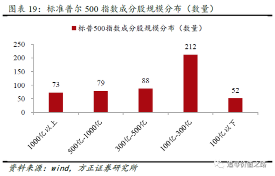 标准普尔500指数成分股市值分布以大市值龙头股为主。截至2022年10月27日,标准普尔500指数总市值1000亿美元以上的成分股共73只。总市值500亿美元至1000亿美元之间的成分股共79只。总市值300亿美元至500亿美元之间的成分股共88只。总市值100亿美元至300亿美元之间的成分股共212只。总市值在100亿美元以下的成分股共计52只,因此标准普尔500指数成分股市值分布总体以大市值龙头股为主。