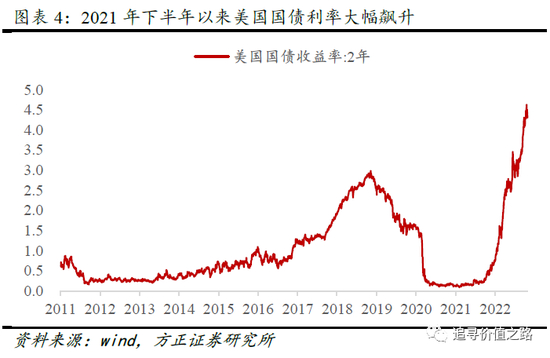 持续上行的通货膨胀使得美联储加息压力越来越大,2022年3月以来美联储已累计加息300个基点。在美联储持续加息预期升温作用下,美国国债利率不断攀升,而且上行斜率极其陡峭,截止2022年10月27日,美国2年期国债到期收益率已经升至4.30%、10年期国债到期收益率升至3.96%。