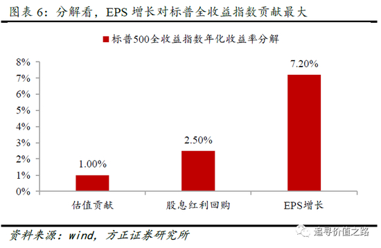 一种观点认为是来自于80年代以后美国无风险利率持续下降导致的股市估值持续抬升,这个说法不错,但是影响的量级远没这么大。对标普500全收益指数收益率进行分解后可以发现,估值抬升对收益率的贡献年化只有1.0%。股息红利回购对收益率的贡献年化约2.5%,这块比估值抬升影响要大,但也并非起决定性主导作用的。