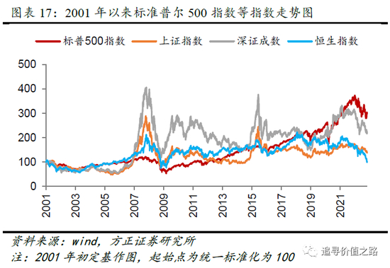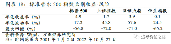 2001年以来标准普尔500指数收益好于上证指数、深证成指、恒生指数等市场指数。我们以2001年1月2日为基日,截止至2022年10月27日,我们发现标准普尔500指数收益表现优异,在各历史阶段整体好于上证指数等其他市场指数。从年化收益率来看,标准普尔500指数年化收益率为4.9%,好于同期的上证指数(1.7%)、深证成指(3.9%)、恒生指数(0.1%)等市场指数,充分体现标准普尔500指数成分股的优质性。