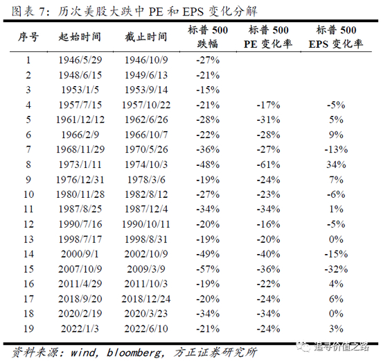 如果我们对历次大跌进行PE和EPS的分解,就会发现,19次美股股价大跌期间,EPS变化率的均值在0附近。有明显负向影响的几次,主要是1968年至1970年、2000年至2002年、2007年至2009年这三次。