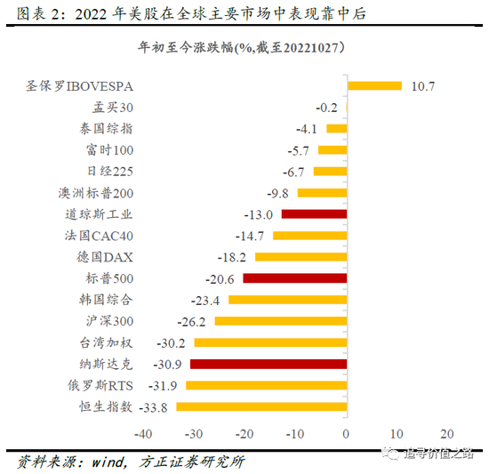 截止2022年10月27日收盘,美股三大指数道琼斯工业指数、标普500指数、纳斯达克指数,全年累计跌幅分别为13.0%、20.6%、30.9%,在全球主要股市中表现明显靠中后。