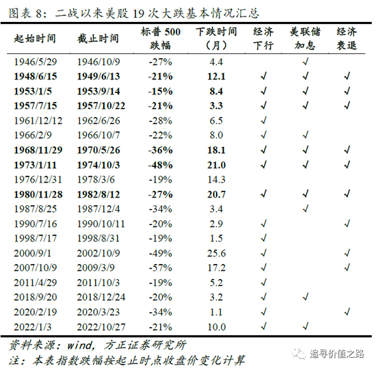 二战后至今,我们统计了美股大跌(定义为标普500指数单次跌幅超过15%)共有19次。