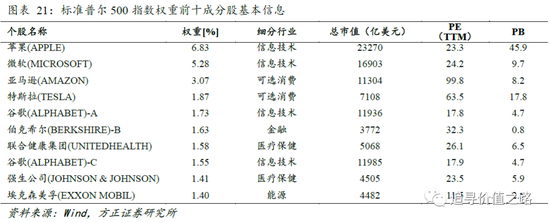 从个股情况来看,标准普尔500指数主要聚焦信息技术、可选消费、医疗保健等行业大市值龙头股。标准普尔500指数前十大成分股主要为苹果、微软、亚马逊、特斯拉、谷歌、伯克希尔、联合健康集团等信息技术、可选消费、金融、医疗保健行业的优质龙头公司。这些成分股具有一定规模,技术实力强,并且成长性、创新性较高。