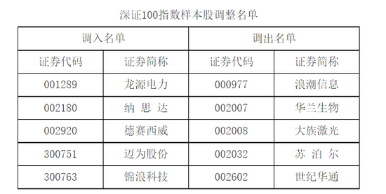 深证100指数样本股方面,此番调入龙源电力、纳思达、德赛西威、迈为股份、锦浪科技5只样本股,同时调出浪潮信息、华兰生物、大族激光、苏泊尔、世纪华通等5只样本股。