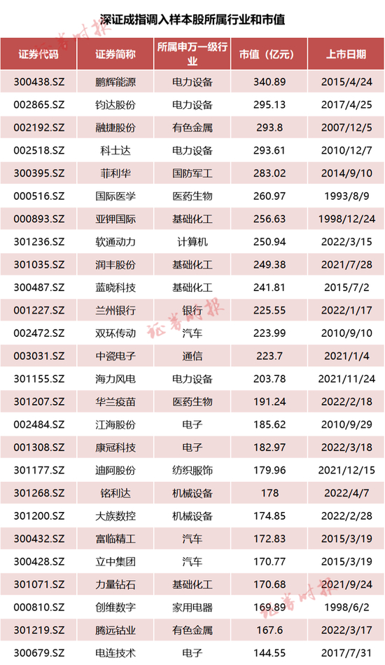 观察深证成指样本股变动,可以发现,此番调入的26只样本股名单中,调入的主板股票有11只,创业板股票有15只;若按照申万一级行业划分(注:下文中所述行业分类亦均为申万一级行业),调入的26只样本股中,电力设备行业股票有4只,基础化工行业股票也有4只,并列为调入股票最多的行业。电子行业与汽车行业均调入3只,亦为调入样本股较多的行业。医药生物行业、有色金属行业、机械设备行业调入的样本股均有2只。家用电器行业、银行业、通信行业、国防军工行业、纺织服饰行业、计算机行业调入的样本股均有1只。从调入样本股市值规模来看,上述调入股市值主要在100亿元至400亿元区间;从上市时间来看,调入的样本股有较多上市时间不足一年的股票,比如铭利达、康冠科技、腾远钴业、软通动力、大族数控、华兰疫苗等,均是今年才在A股市场上市的股票。