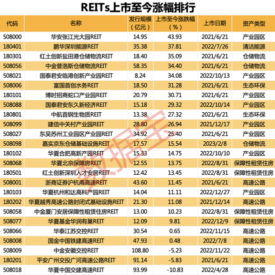 数据宝统计,从上市以来的累计涨幅来看,产业园区类型的华安张江光大园REIT累计上涨43.93%居首;鹏华深圳能源REIT是目前唯一已上市的清洁能源REITs,上市不到一年时间累计涨幅达37.81%。另外,红土创新盐田港仓储物流REIT、中金普洛斯仓储物流REIT、国泰君安临港创新产业园REIT等累计涨幅均超30%。
