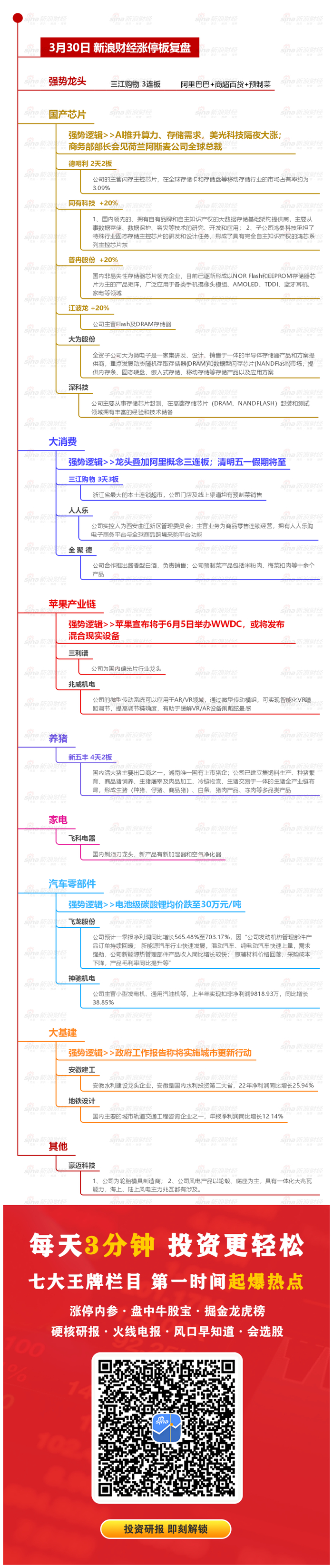 3月30日沪深两市涨停分析:消费+阿里概念股三江购物晋级3连板 市场资讯 2023.03.30 15:21 日k线图 【3月30日沪深两市涨停分析】沪指探底回升涨0.65%,大消费板块午后集体走强。消费+阿里概念股三江购物晋级3连板,芯片股德明利2连板,一图看懂>>