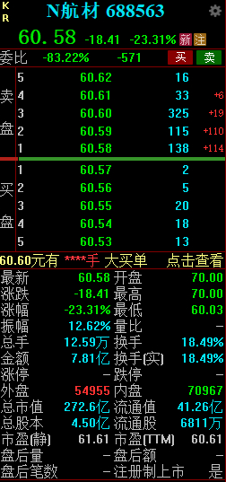 7月19日消息,科创板新股航材开盘破发,截至发稿,股价报60.58元,最新市值272.6亿元。