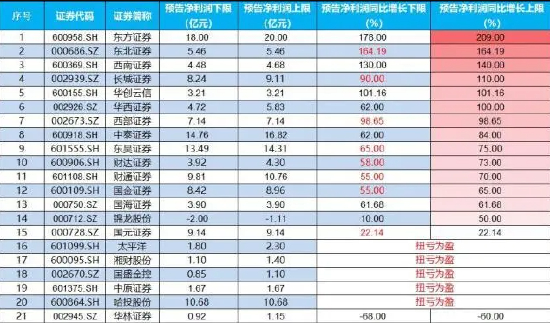 截至目前,从21家上市券商及券商概念股官宣业绩预告,15家券商归母净利润同比增长,5家扭亏为盈,业绩下滑及延续亏损情况的则分别仅有1家。