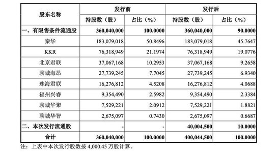IPO后,掌舵人秦华持股45.8%,为第一大股东,按目前市值近300亿计算,身家为137.4亿元。KKR跟北京君联分别为第二、第三大股东,持股分别为19%和9.3%。