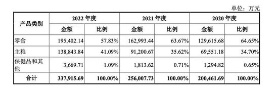 招股书显示,2020 年-2022 年,公司主营业务收入分别为20亿元、25.6亿元和 33.79亿元,主营业务收入的复合增长率达29.83%,增长较快。从收入占比来看,零食与主粮产品是公司收入的主要来源,涉及的核心技术已实现产业化,其中主粮是公司利润增长点,其收入占比在逐年提高。