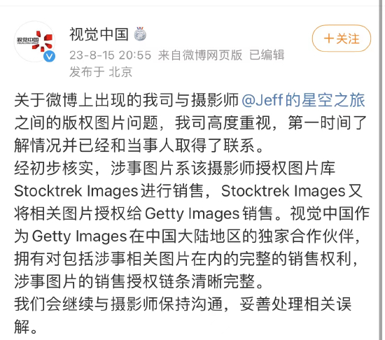 当日晚间,视觉中国回应称:关于微博上出现的我司与摄影师@Jeff的星空之旅之间的版权图片问题,我司高度重视,第一时间了解情况并已经和当事人取得了联系。