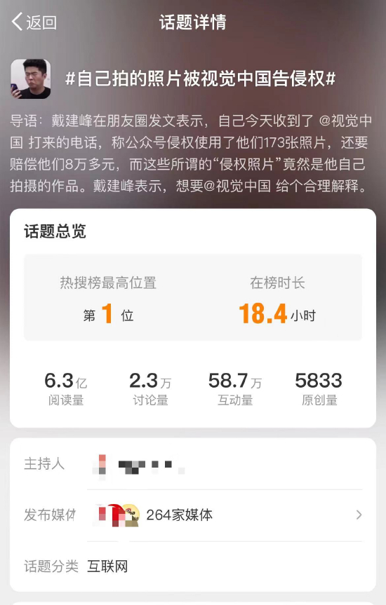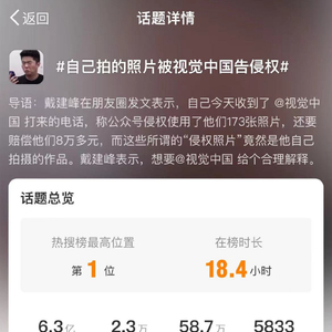 8月16日消息,近日,摄影师戴建峰发文称其使用自己的作品被视觉中国告知侵权,引发广泛关注,一度登上微博热搜第一。