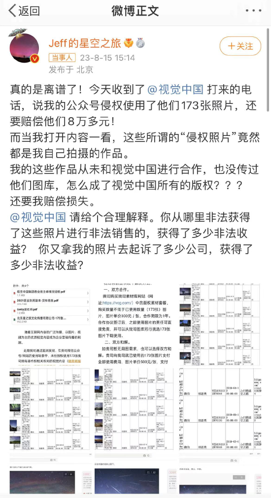 8月15日下午,星空摄影师戴建峰发博表示,接到视觉中国的电话,称其本人的公众号侵权使用了视觉中国173张照片,要赔偿他们8万多元。