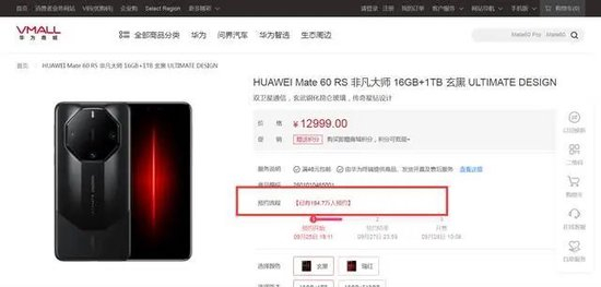 截至目前,在华为商城已有184.7万人预约了华为Mate60 RS非凡大师。此外,该商品也在其他电商平台开启了预约,但无法看到预约人数。