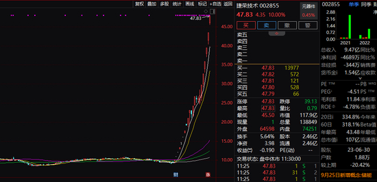 行情数据显示,捷荣技术今天上午盘中再度触及涨停,若从8月下旬低位开始算起,在短短一个月的时间,捷荣技术股价从9元左右上涨至今天盘中最高接近48元,股价足足翻了5倍。
