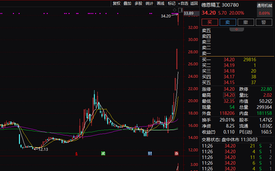 德恩精工今天上午再度触及“20cm”涨停,至此,该股已连续4个交易日盘中曾触及“20cm”涨停。