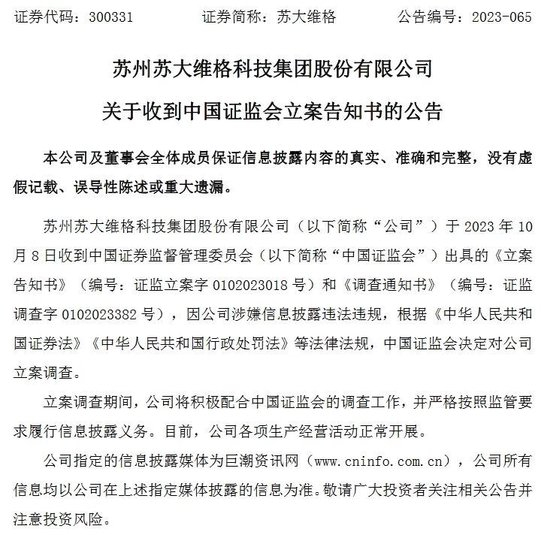 10月8日晚间,苏大维格披露收到中国证监会立案告知书,因公司涉嫌信息披露违法违规,中国证监会决定对公司立案调查。苏大维格称,立案调查期间,公司将积极配合中国证监会的调查工作,并严格按照监管要求履行信息披露义务。目前,公司各项生产经营活动正常开展。
