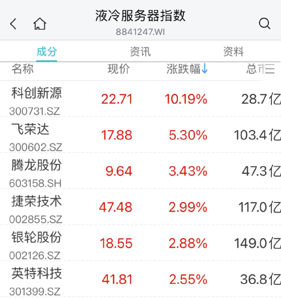 液冷服务器概念拉升,科创新源大涨超10%,飞荣达、腾龙股份、捷荣技术涨幅居前。