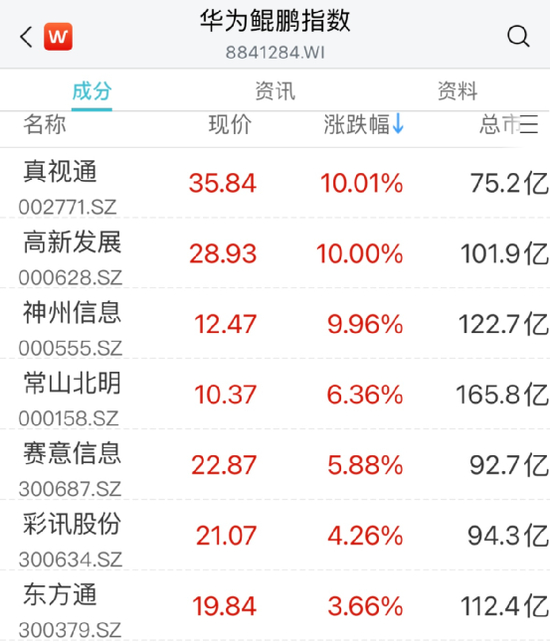 华为鲲鹏概念早盘快速冲高,真视通、高新发展、神州信息涨停,常山北明涨超6%。