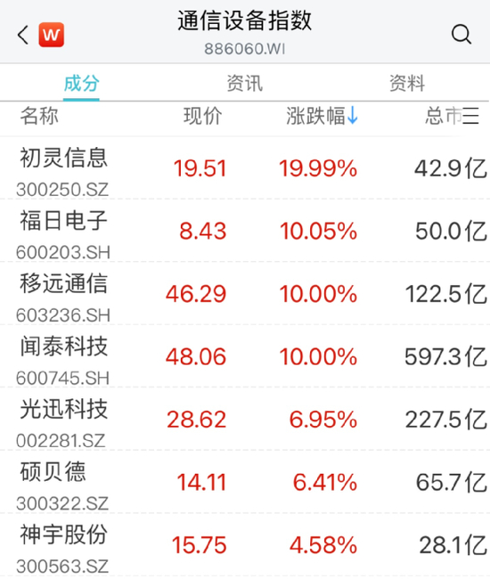 通信设备股纷纷走高,初灵信息20CM涨停,福日电子、移远通信、闻泰科技等先后涨停。