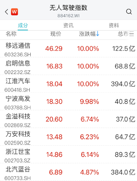 无人驾驶概念同样走高,宁波高发3连板,启明信息、移远通信、江淮汽车等涨停。