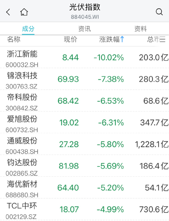 光伏板块早间快速走低,浙江新能跌停,锦浪科技、帝科股份、爱旭股份、通威股份均跌超5%。