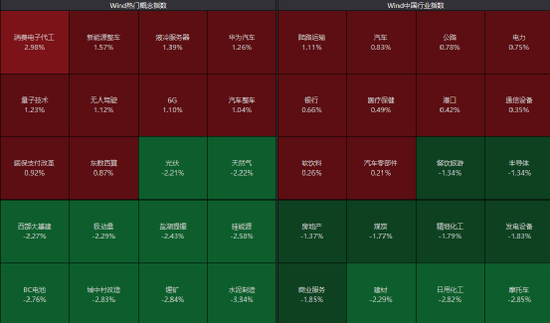 板块方面,华为汽车概念反复活跃,无人驾驶、汽车整车、通信设备等板块纷纷走高;而锂矿、光伏、房地产等方向跌幅居前。整体上跌多涨少,超3800只个股下跌。