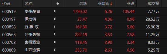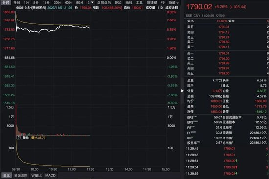 此后,贵州茅台股价又迅速回落,截至到当日午间收盘时,该股股价上涨6.26%,报收于1790.02元/股,半天成交金额达到140亿元。在贵州茅台的带动下,五粮液、泸州老窖、舍得酒业、山西汾酒、水井坊、伊力特等A股白酒纷纷跟涨。