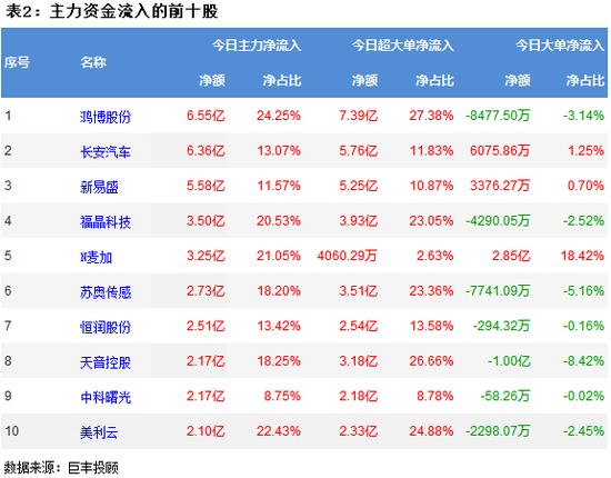从两市个股主力资金流向来看,鸿博股份获主力资金净流入6.55亿,长安汽车获主力资金净流入6.36亿,新易盛获主力资金净流入5.58亿,福晶科技获主力资金净流入3.5亿,N麦加获主力净流入3.25亿。