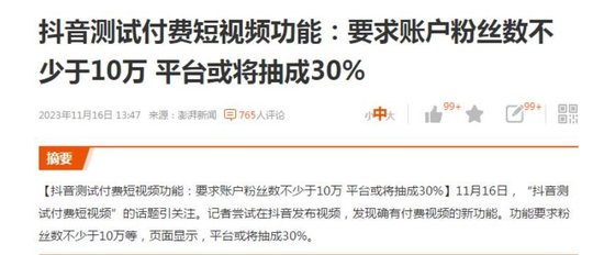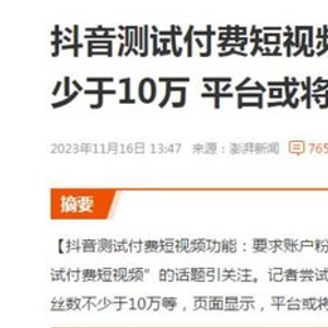 11月17日,澎湃新闻报道,抖音于近期开启测试视频内容付费服务,即用户在平台观看部分视频内容时,需要付费才能解锁全部的内容。目前,该功能处于小范围测试阶段,只针对10万粉丝以上、账号状态正常、无违规情况、原创度高的部分个人开放内测,后续可等待内测范围逐步开放。
