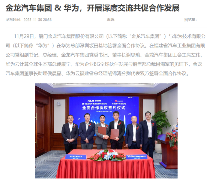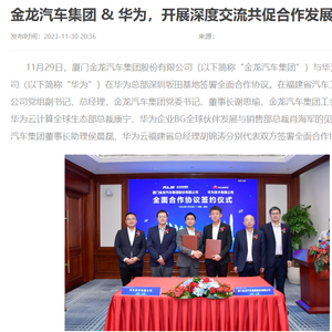 金龙汽车集团官网消息,11月29日,厦门金龙汽车集团与华为技术有限公司签署全面合作协议。根据协议,双方将深入整合各自优势资源,全面深化合作,建立密切的合作伙伴关系,助力加速金龙汽车集团在全球数字化规划建设、金龙汽车一张网、金龙云、ICT基础设施、信息安全及业务合规等方面的数字化进程,不仅如此,未来还将在人工智能大模型布局、自动驾驶、大数据应用、企业管理咨询与提升等方面开展合作。