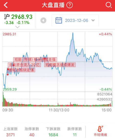 12月6日,大盘全天震荡分化,三大指数涨跌不一。截至收盘,沪指跌0.11%,深成指涨0.66%,创业板指涨0.58%。