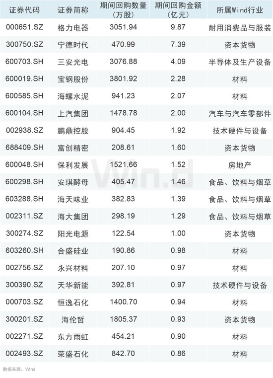 目前,格力电器年内回购金额居首,达到9.87亿元,宁德时代、三安光电、包钢股份、海螺水泥、上汽集团年内回购金额均超2亿元。